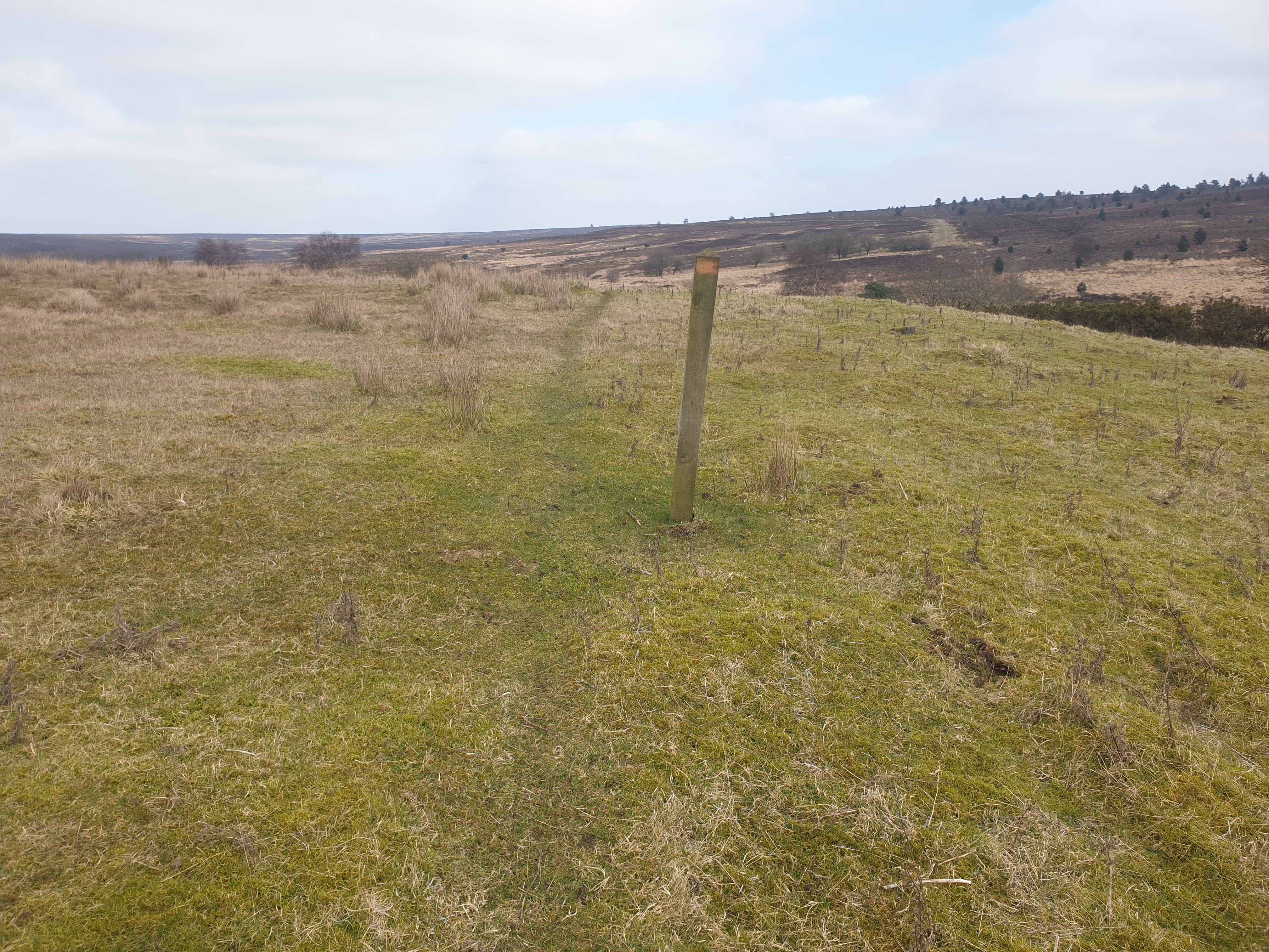 After passing the base the path then heads north across grassland, the path is easy to follow with the wooden orange marker posts.