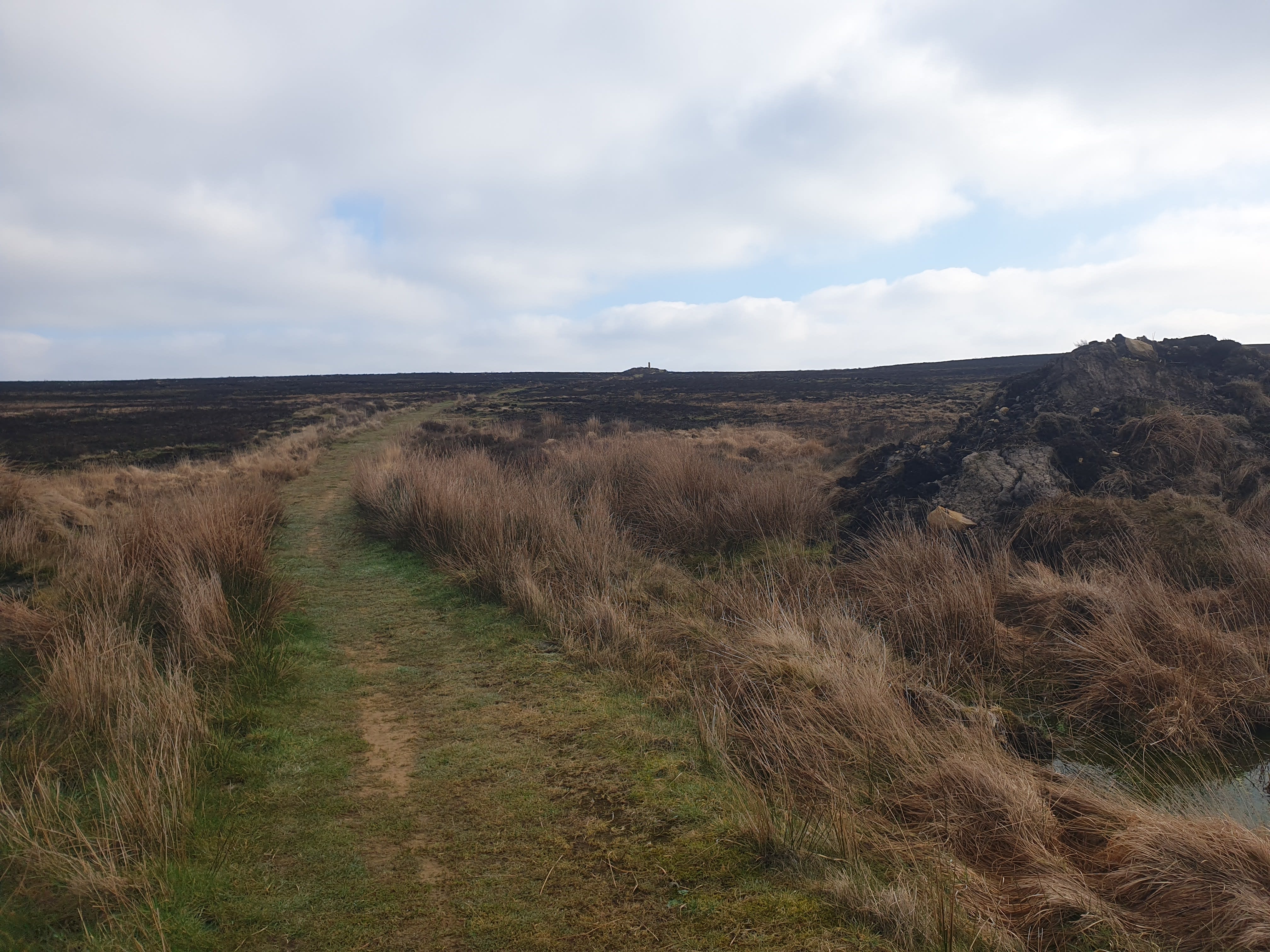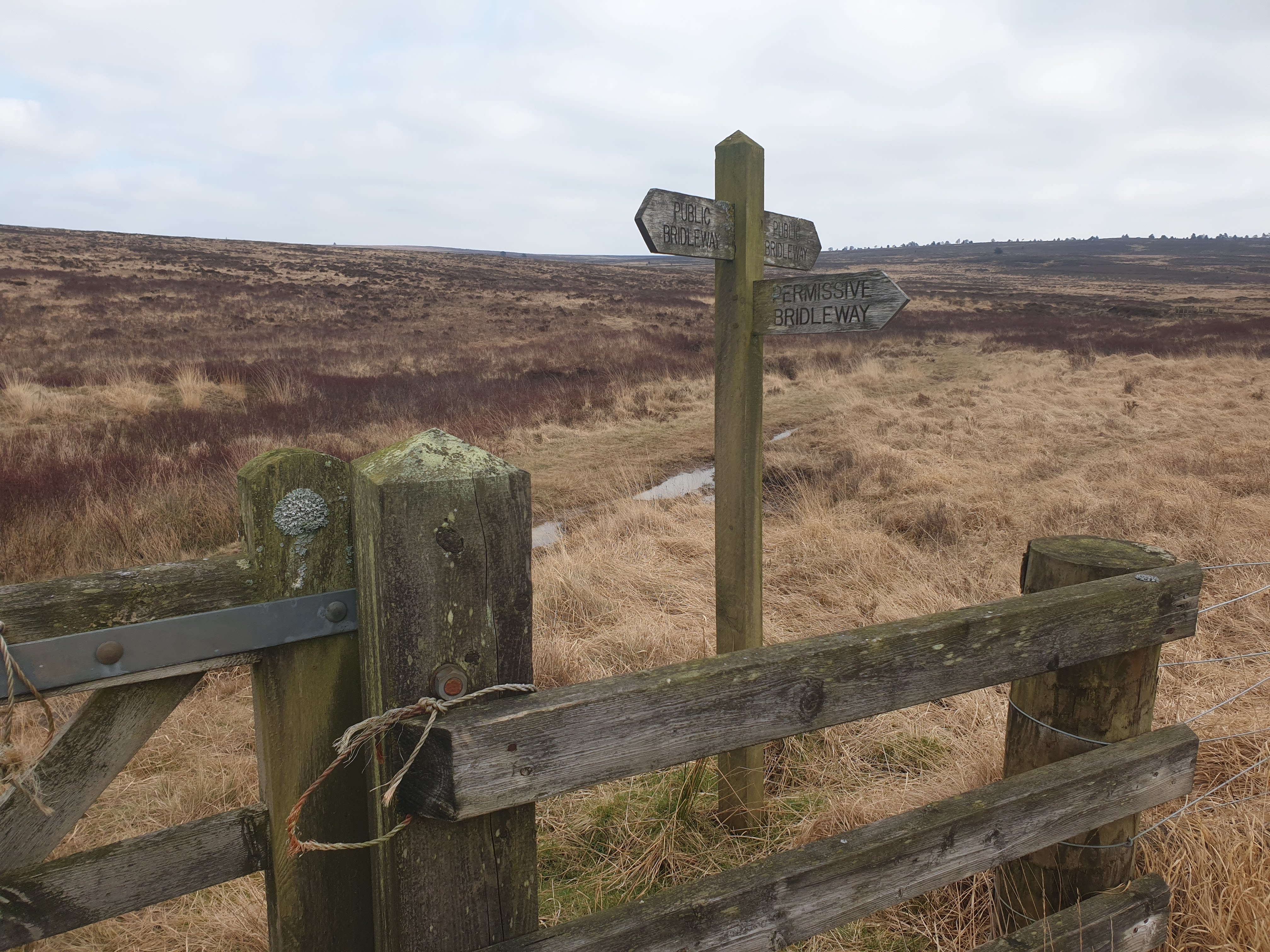 Follow the track through a wooden gate where the path changes to grass and peat.