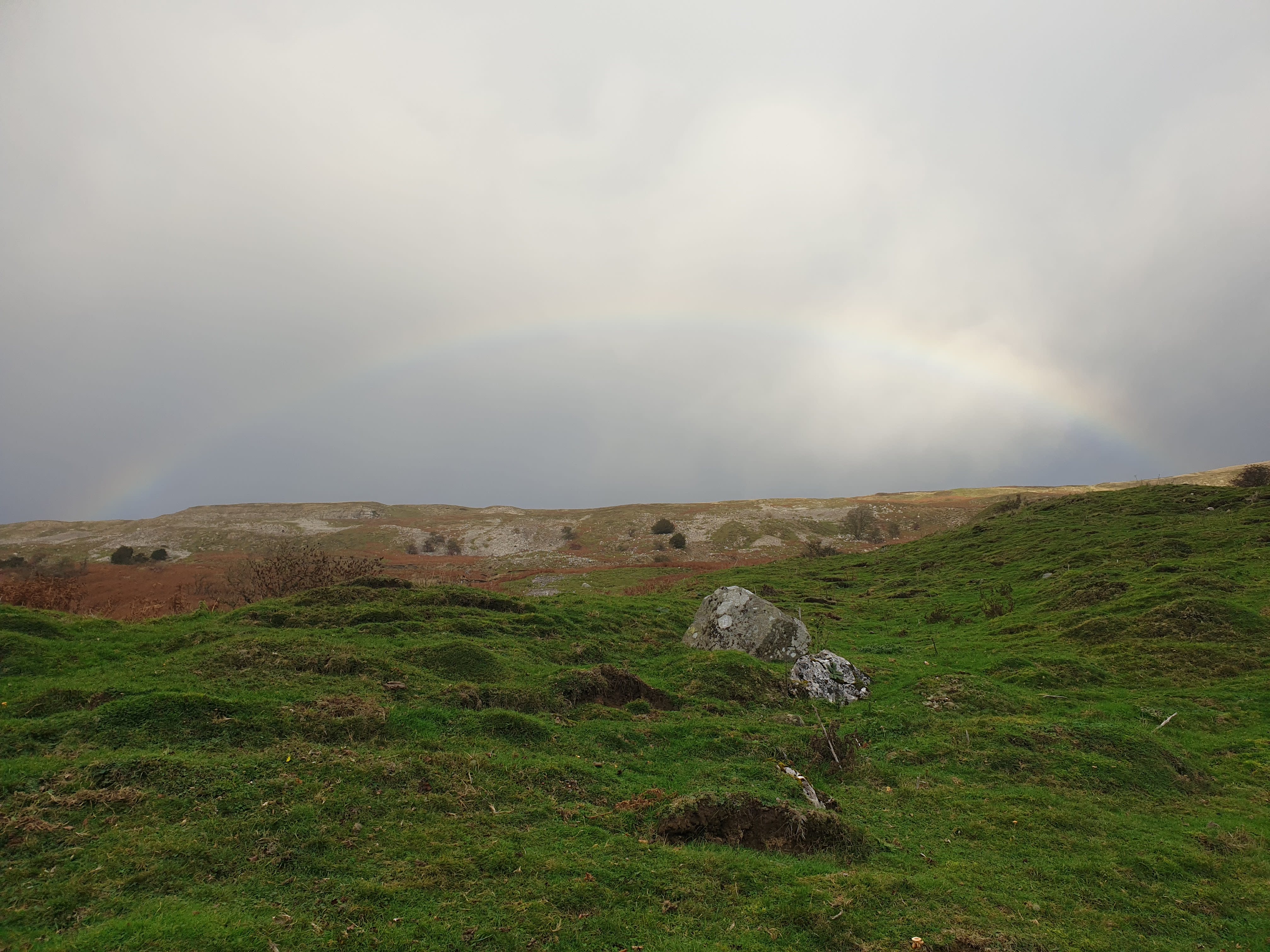 Looking across the valley, the bottom of the hill, behind the trees is the route back. Here is the first view of a rainbow. Rainbows cannot be guaranteed on this route.