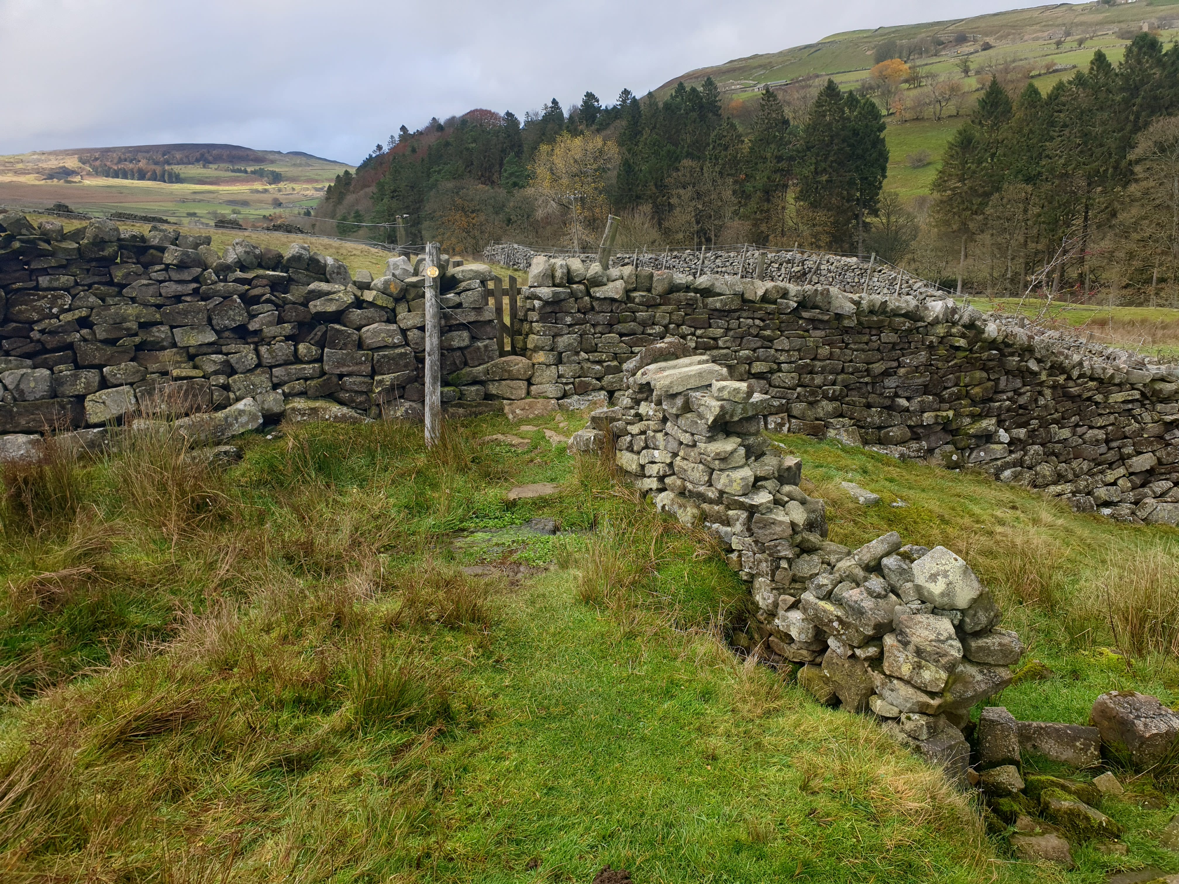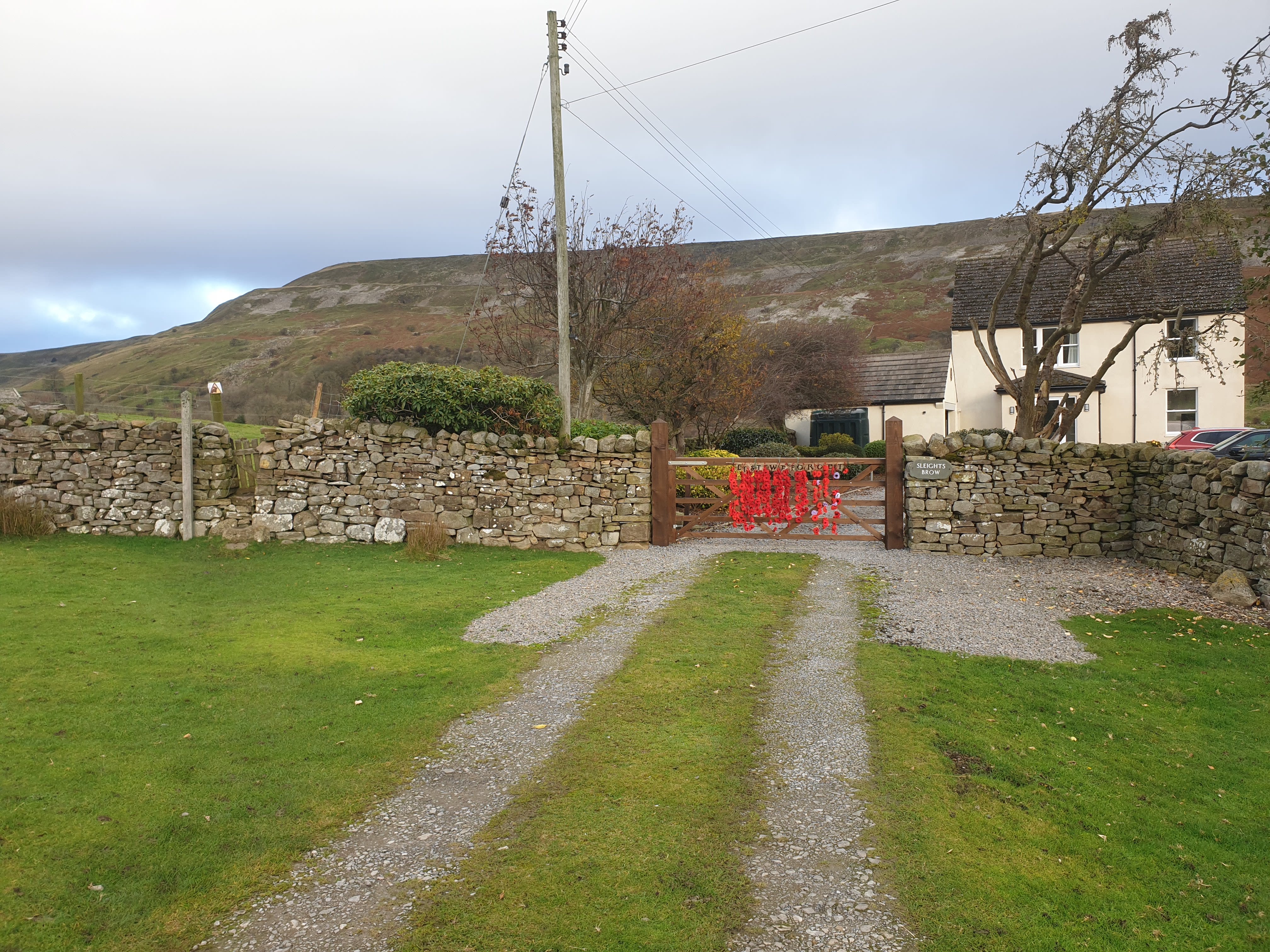 Follow the road north, up Jenny Hill for a short distance, just as the orad bends to the left, take the footpath on the right, just by this wonderfully decorated gate at Sleights Brow (this walk took place on Remembrance day weekend).