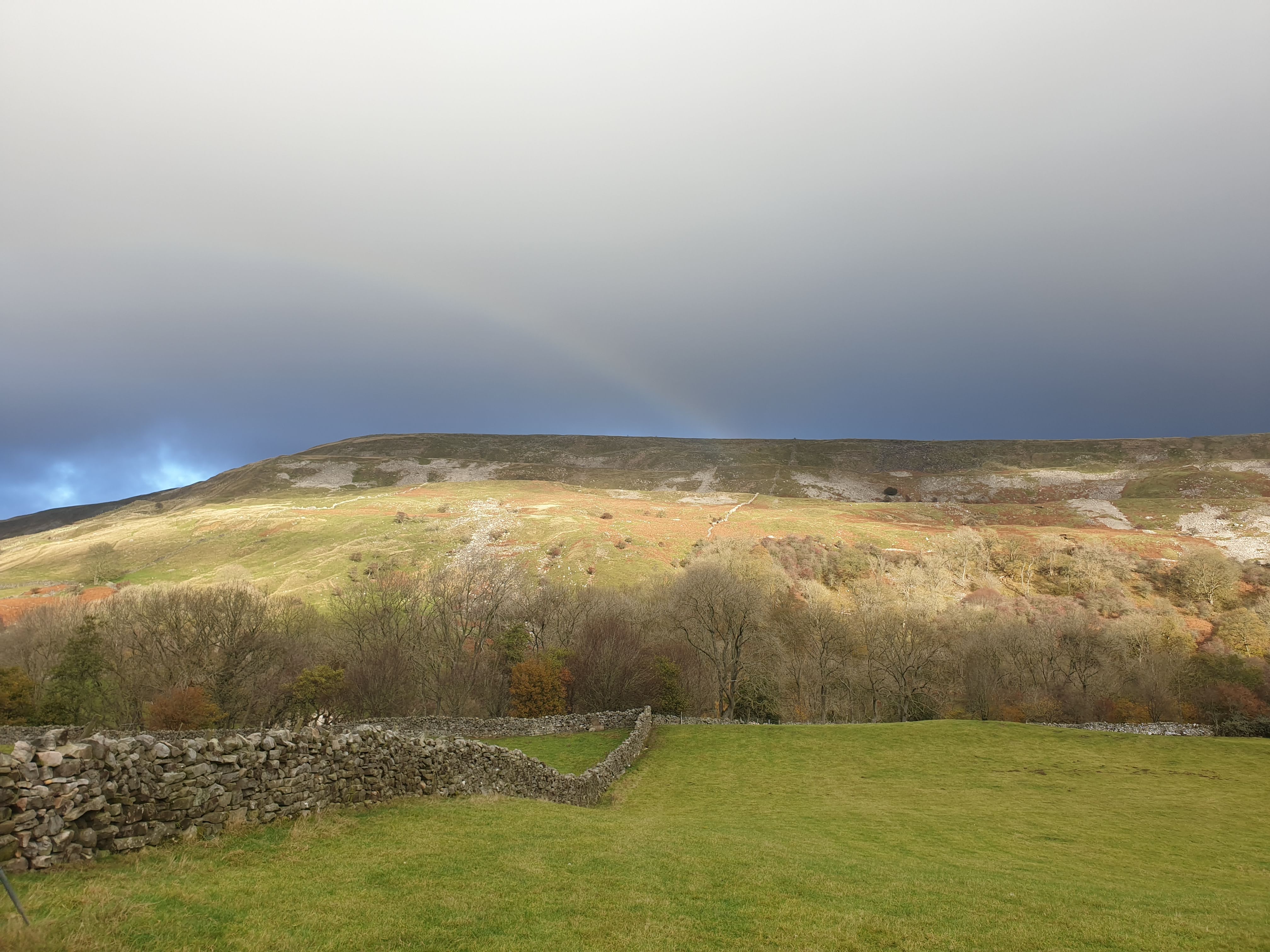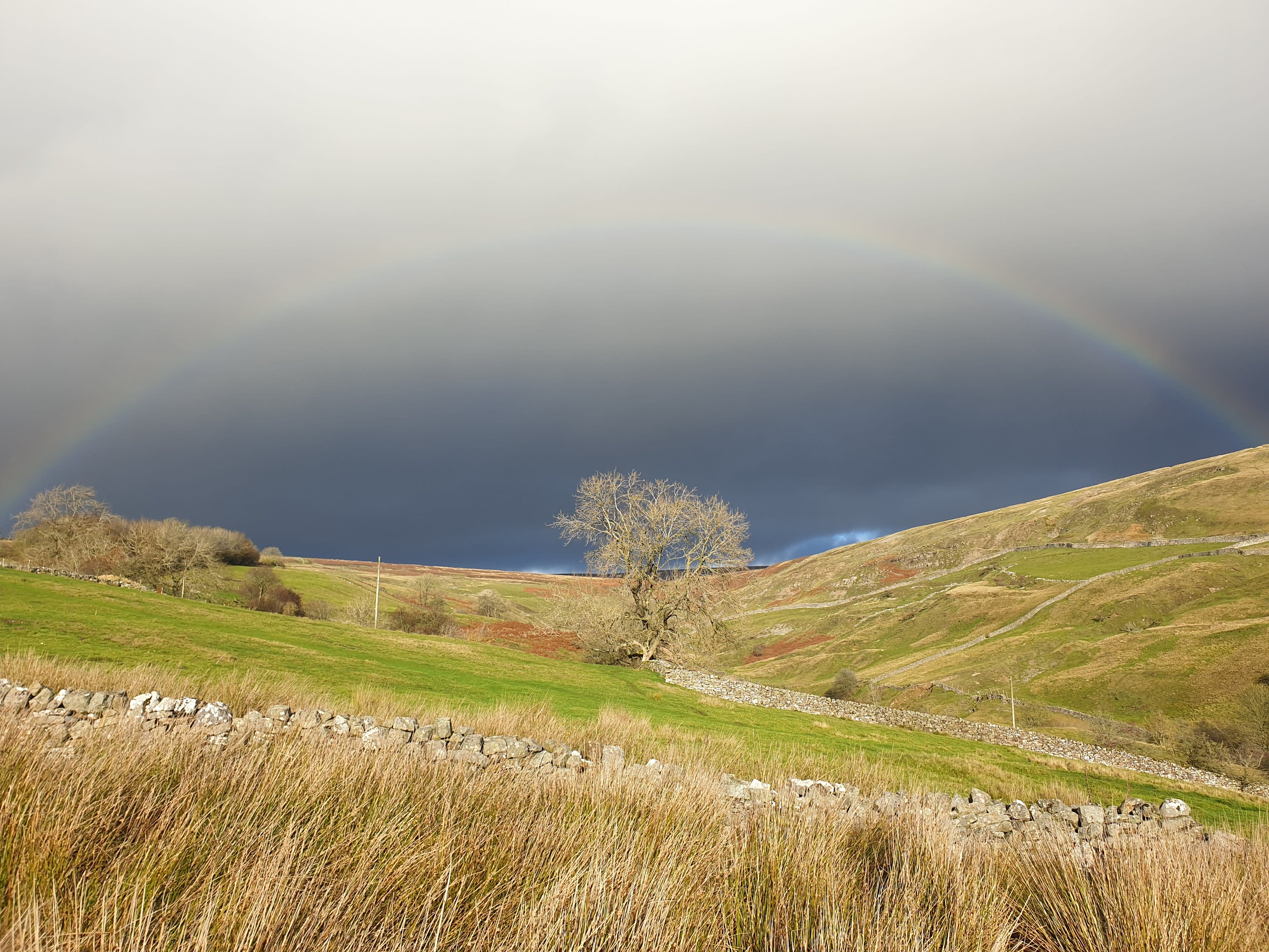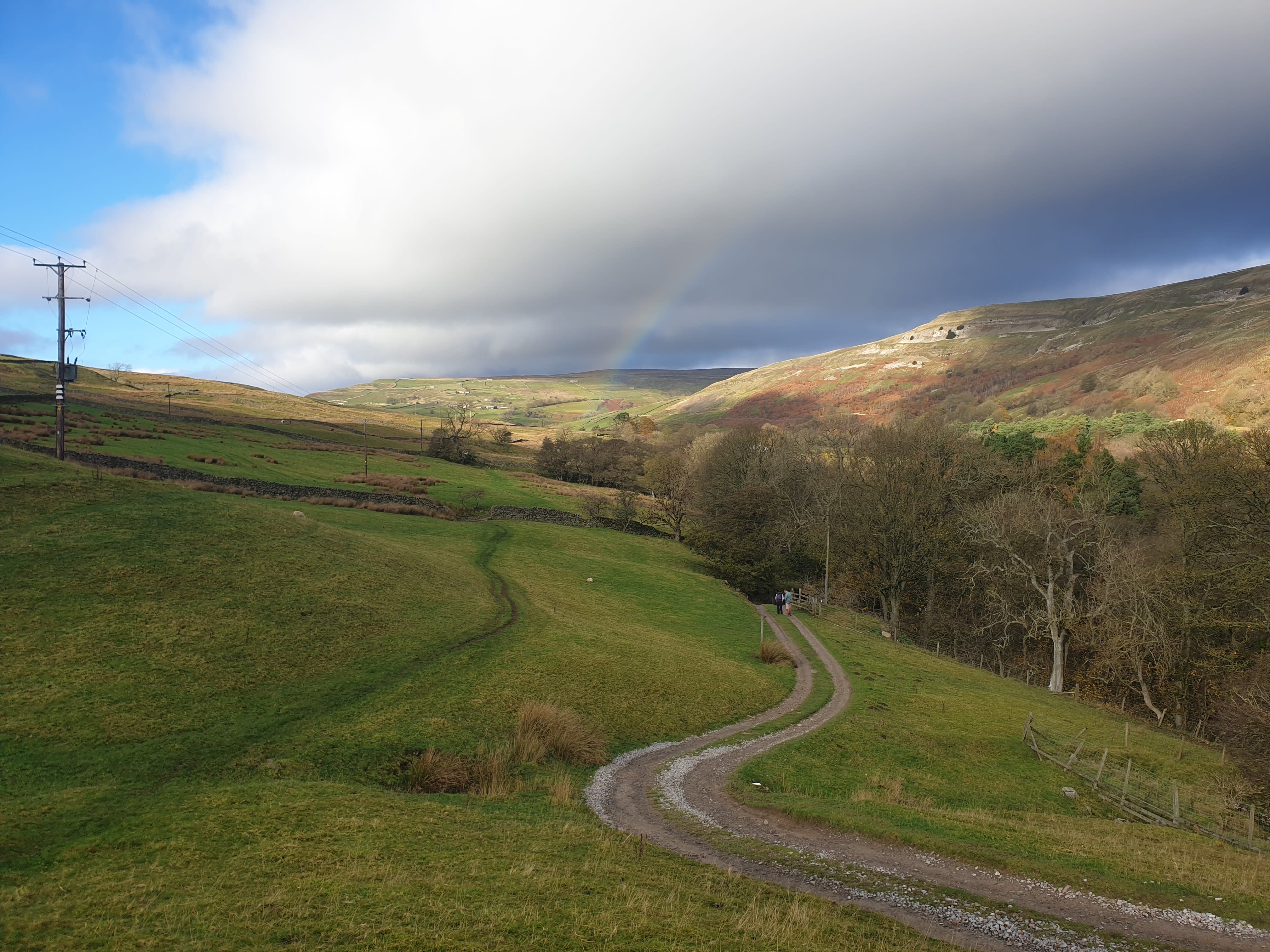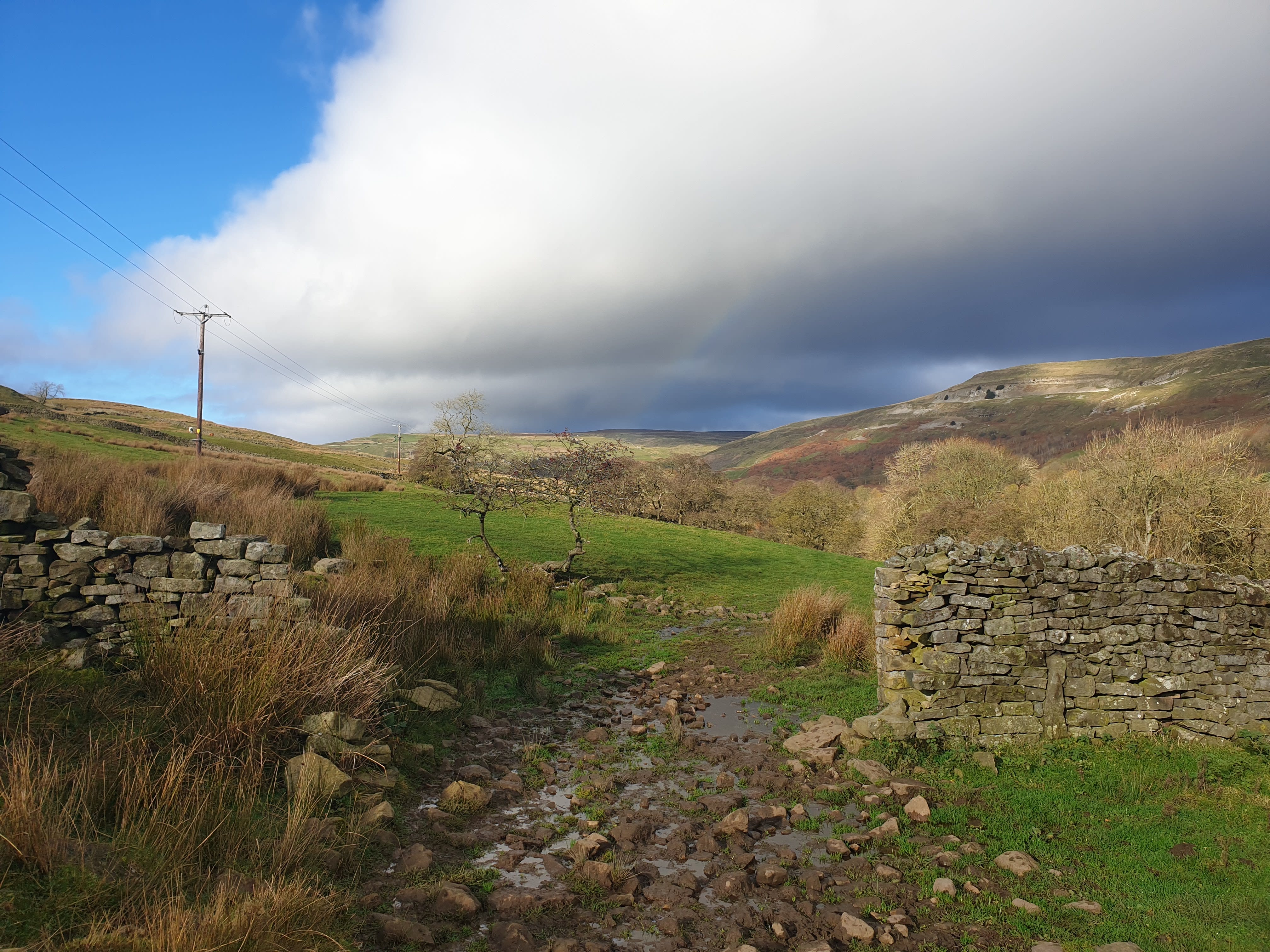 Follow the river through some woods for a while. Time for one last rainbow as the easterly route then heads south back towards Reeth.
