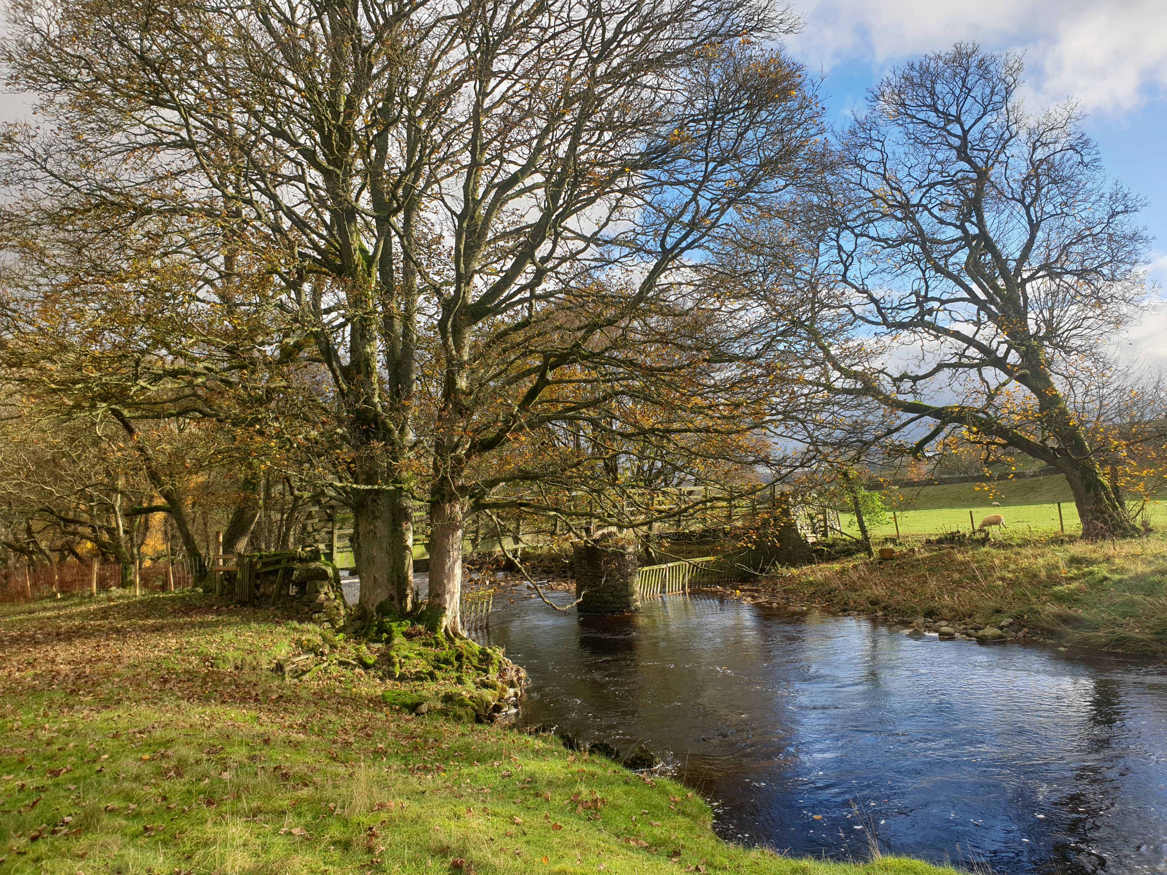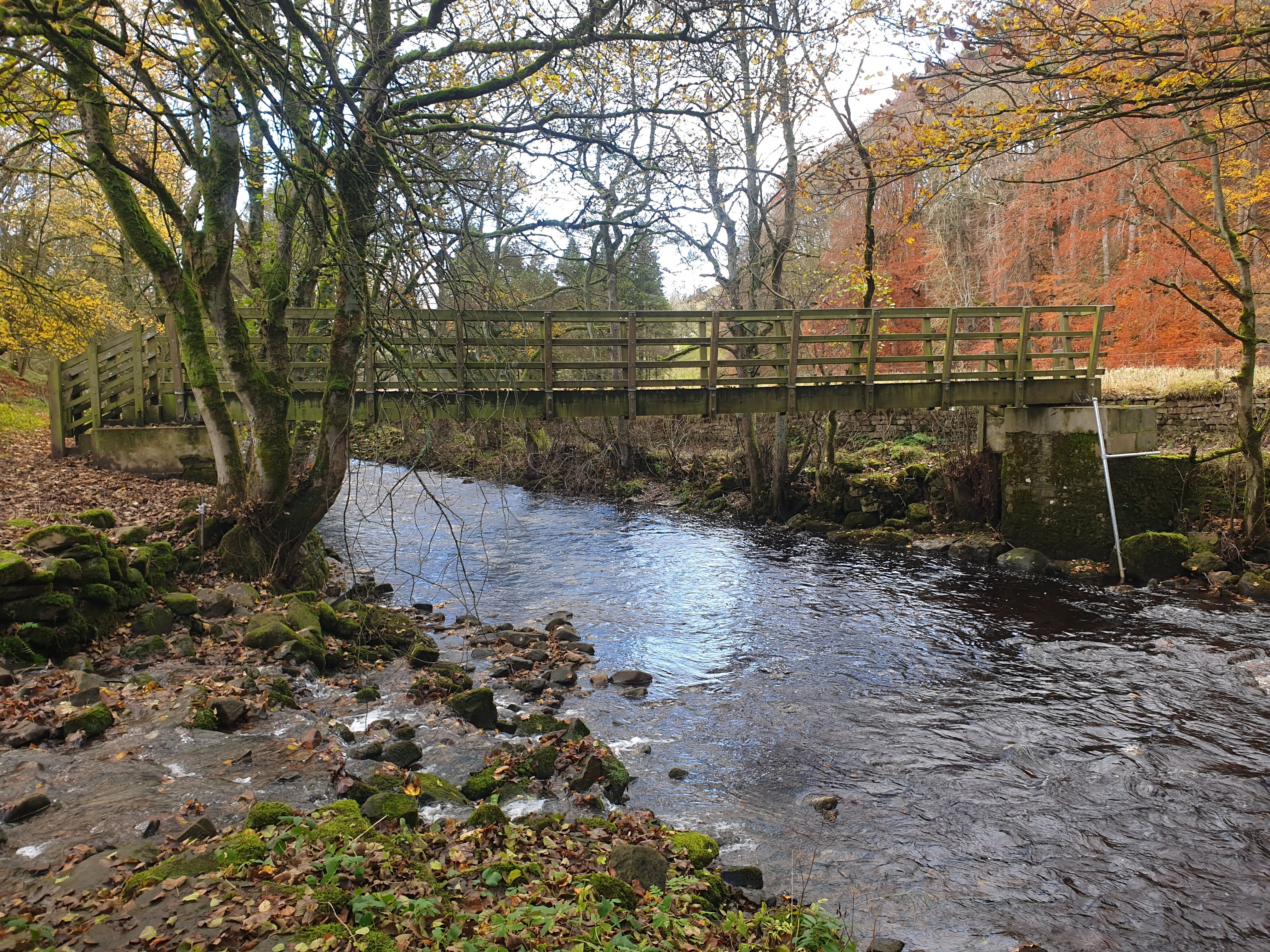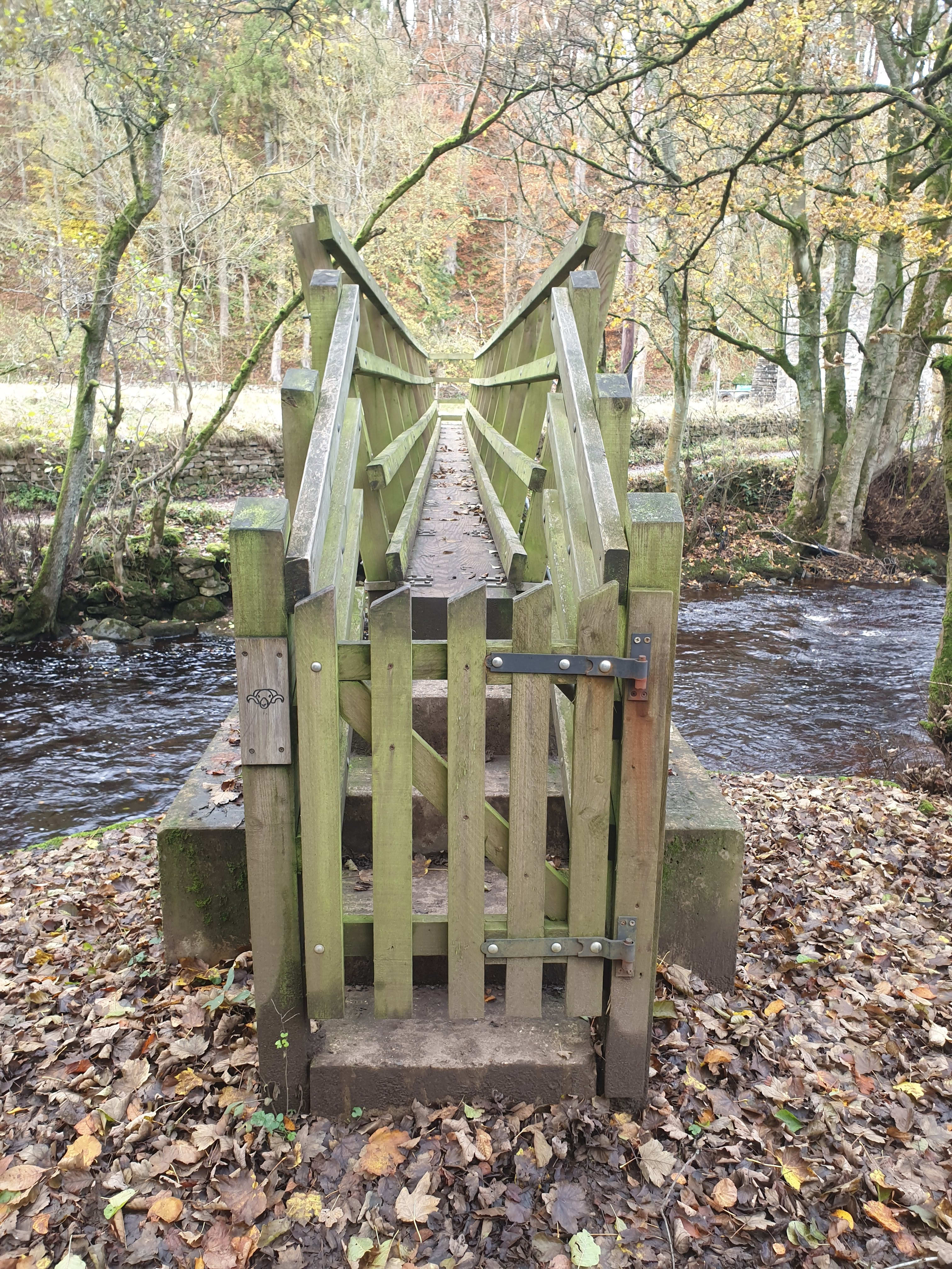 Following the riverside path for a short distance to this footbridge. Cross the river at this footbridge, note the slight ford on the left just before the bridge where a stream from Arkle Town meets the river.