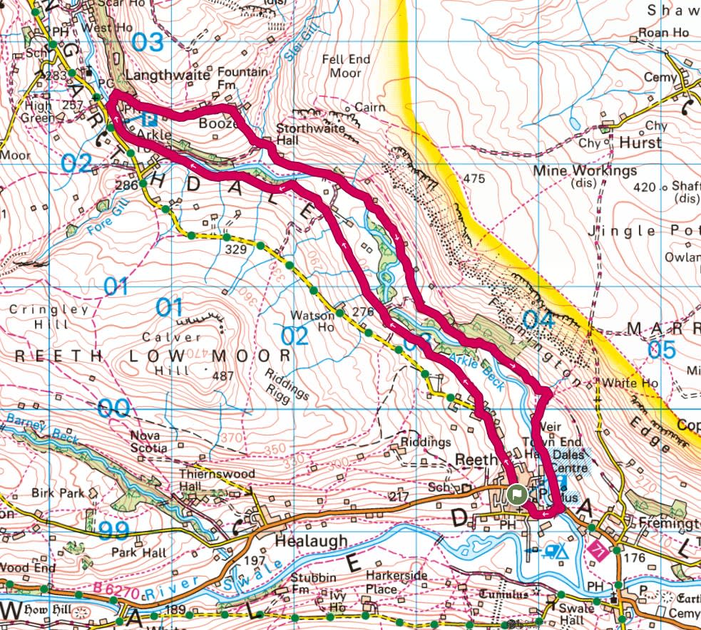 This route starts in Reeth, parking at/on the village green, and follows the river north west through grassy fields to Langthwaite where you do an about turn and head back to Reeth on the other, more overgrown, side of the valley via the little village of Booze.